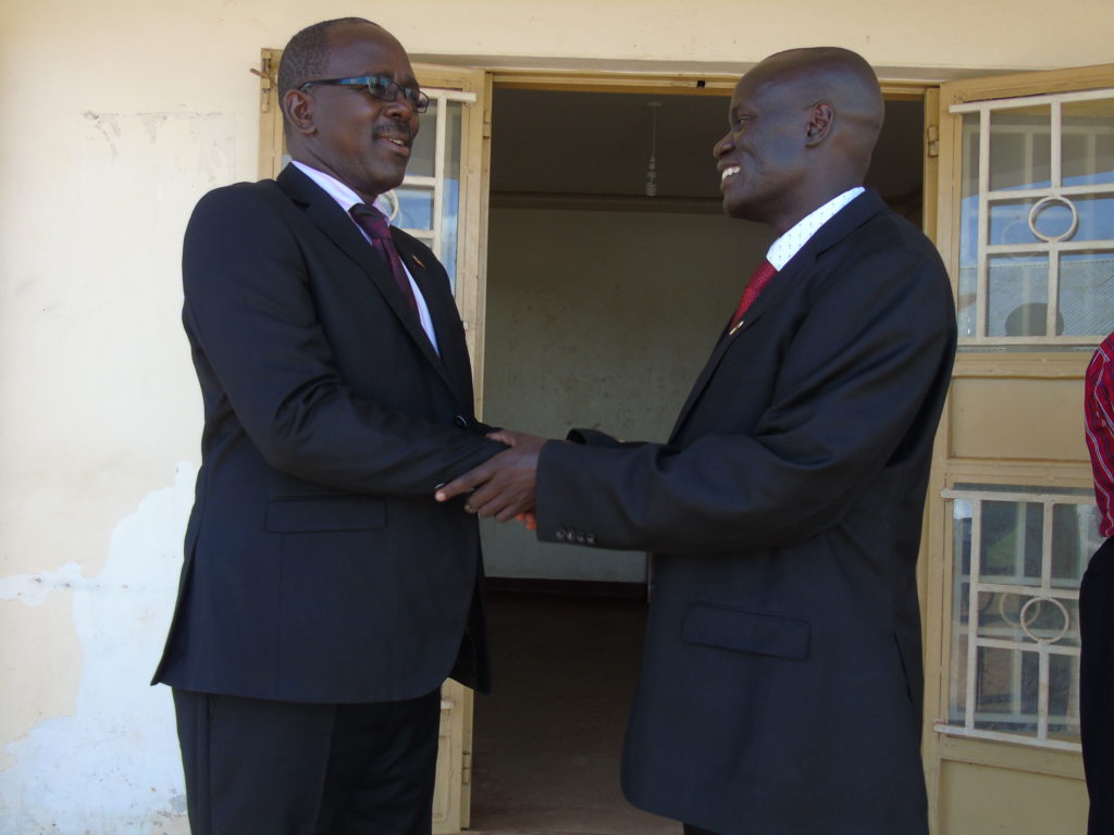 Gulu Chief Magistrate, Deogratious Ssejemba(left) greets Douglas Peter Okello(right), the Omoro district LC V Chairperson (Photo by James Owich)
