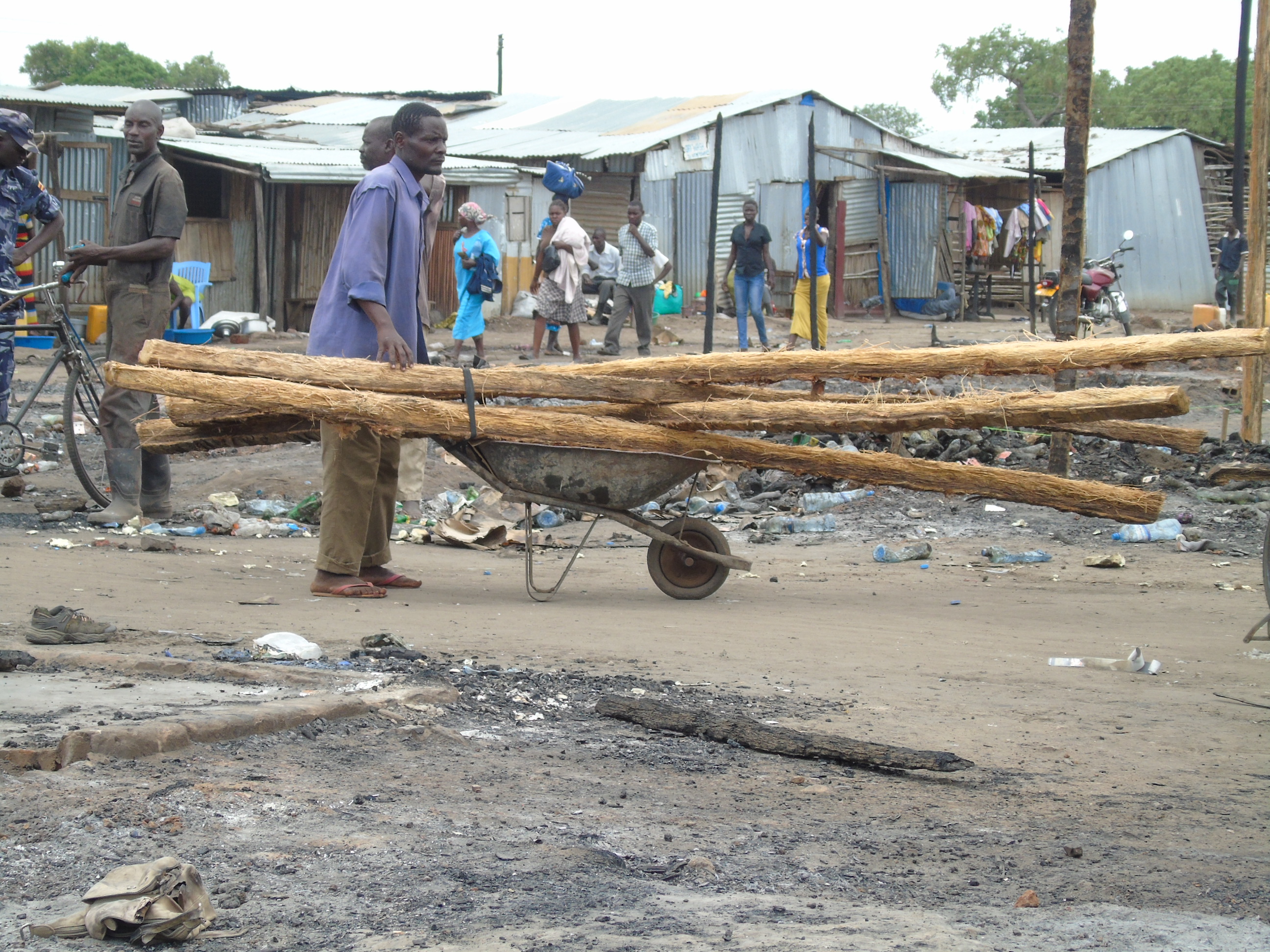 A man carries building materials at Elegu Border Market in Amuru district after fire swept through the market Sunday morning(Photo by James Owich)