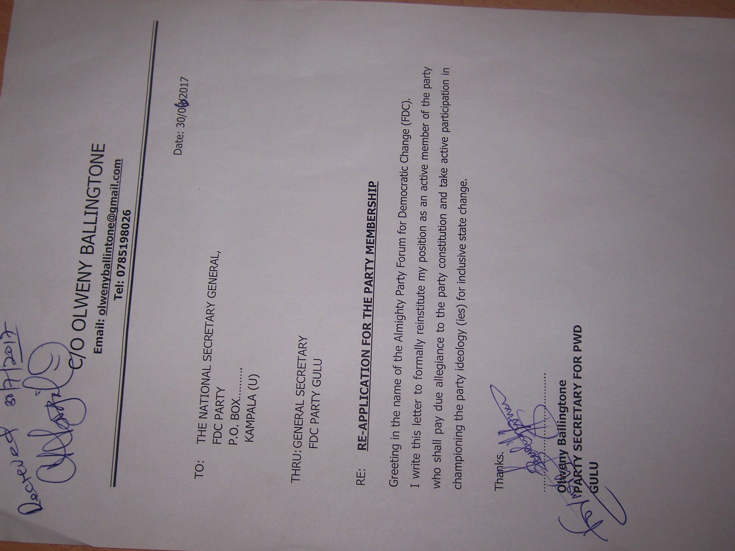 Chagga Oyat, the Gulu district FDC secretary says between June and July this year, his office has received letters from the various former party members requesting to join the party.